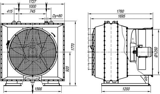 Габаритные размеры агрегата воздушно-отопительного А02-50П на базе двух паровых воздухонагревателей КП3-12-СК01УЗМ (изготавливается по спецзаказу).